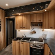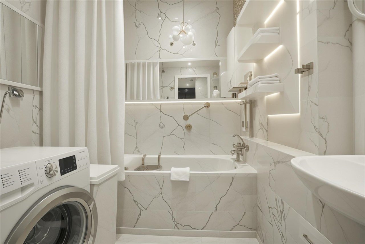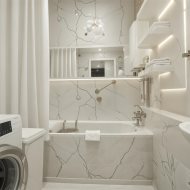 Łazienka z wanną, wyposażona w pralkę. Na ścianach kasetony imitujące kafelki – łatwość demontażu. Oddzielne WC wraz z umywalką.
