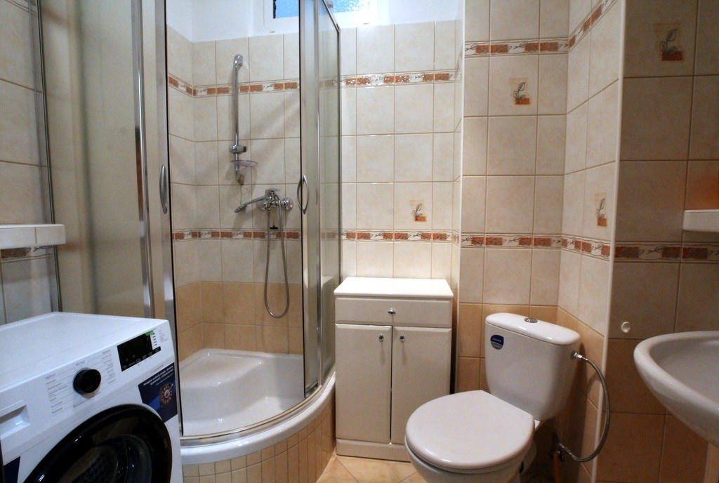 Łazienka z wc, w tonacji beżowej, wanna, umywalka + pralka.