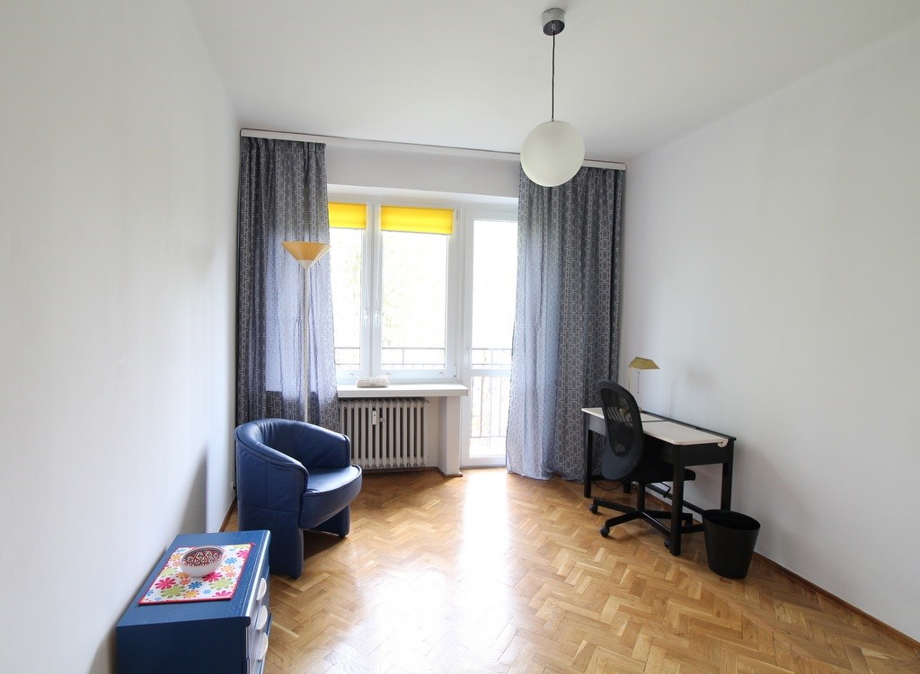 Dwa niezależne jasne, nie klaustrofobiczne, ustawne pokoje, każdy z balkonem. Wyposażenie jak na zdjęciach, możliwość doposażenia w łóżko lub kanapę.